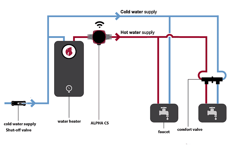 Please note: Unlike the diagram above, the Grundfos UP15-10S "Comfort" series hot water system works in the following manner: The comfort valve is installed under the faucet farthest from the water heater. The UP 15 series recirculation pump moves the hot water from the heater throughout the pipe back to the heater through the cold water line. As the water heats up at the comfort valve, it closes. When a faucet is turned on, warm water is instantly available for use with no waste.