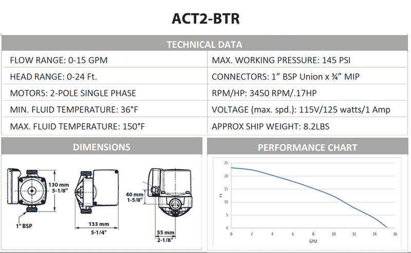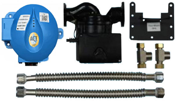 The ACT2-BTR "One Pump Solution" system is easily installed horizontally under a kitchen or bathroom sink. System comes equipped with programmable digital controller with integrated Bluetooth activation, (2) custom blue tees, (2) 3/4"x 18" water heater flex lines, (2) 3/8" x 1/2" x 12" sink flex lines, (2) 1/2" fipt x 3/8" adapters and (1) small mounting bracket.