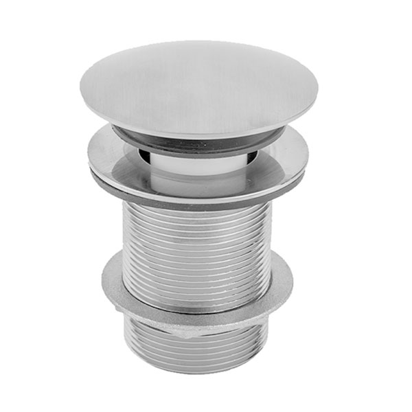 This Jaclo strainer body features: 3" length threads for thick tubs. Brass body. Flange width: 2-13/16" Outside Diameter. Coarse threads. Thread count: 11-1/2 TPI x 3" long. Approximate outside diameter of threads 1-7/8". Forged brass toe touch cap (2" diameter). Fits into 11028 and 11008 drain elbows. Toe touch mechanism has 5/16"-16 thread post pin. Durable chrome finish